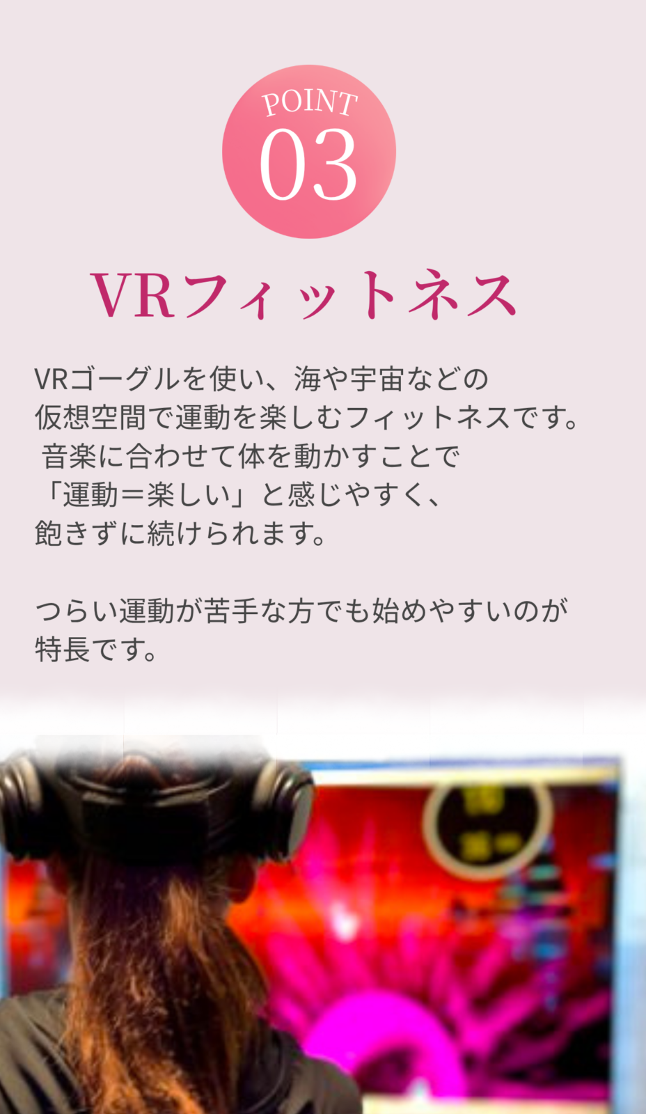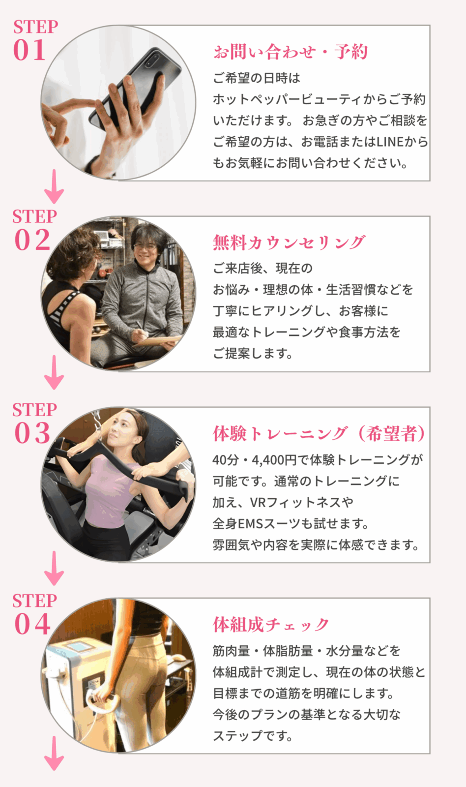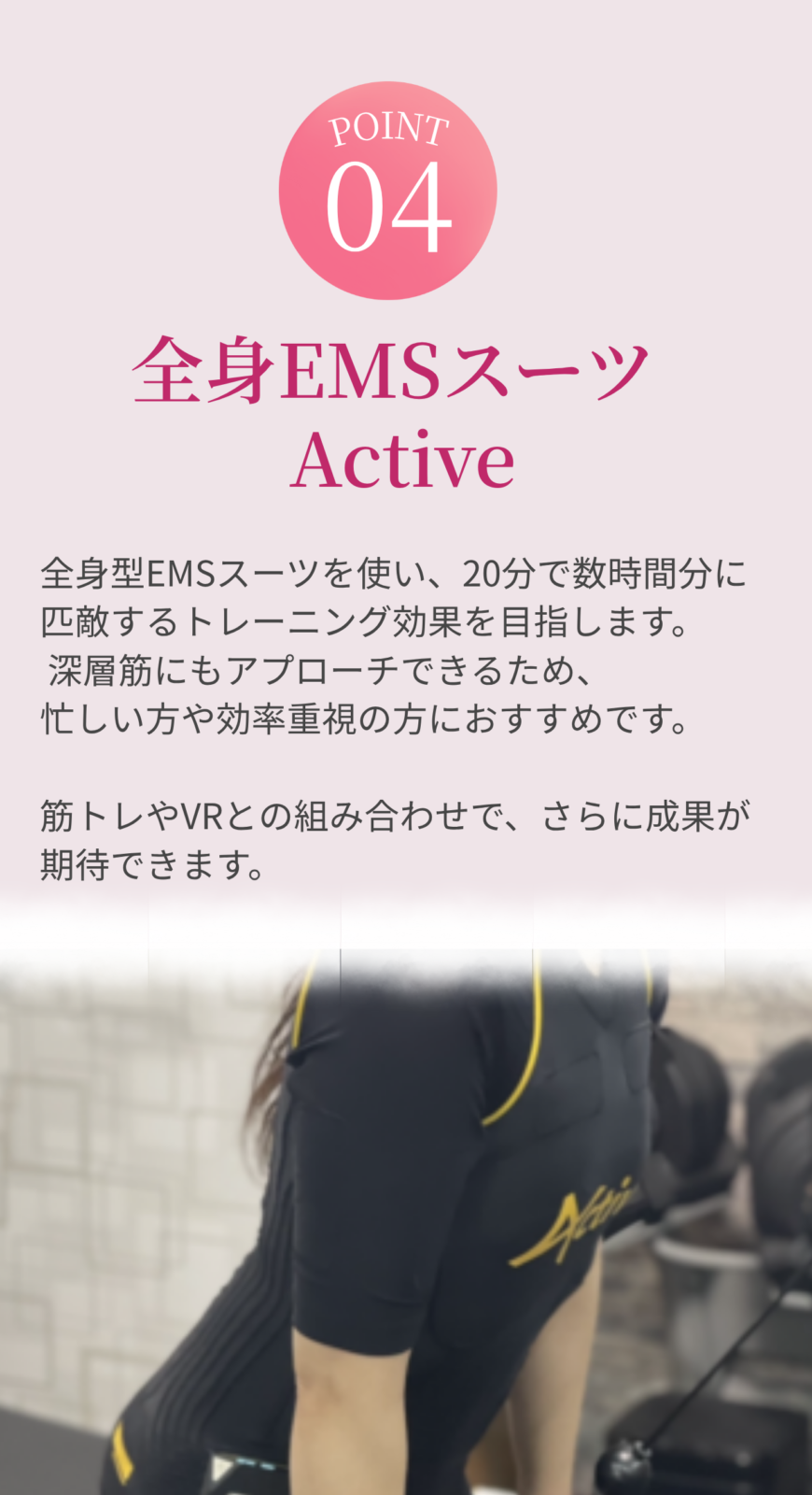 普通のトレーニングに加えVRトレーニング、全身EMS スーツの体験も行っております。ぜひ無料カウンセリングを一緒に受けて頂き、すべてご納得頂いてから入会をして頂きたいと思っております。