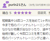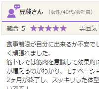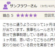 こちらに通うようになって1ヶ月ほどになります。最初は半信半疑で食事制限やトレーニングを始めましたが、この1ヶ月で5kg減量と成果が出ています。食事もルールさえ守れば、たくさん食べる...