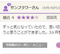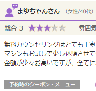 ずっと気になっていたので、思い切って伺いました。丁寧にカウンセリングしていただきました。色々とお話を聞くうちに、頑張ってみようと思うことができました。3ヶ月間宜しくお願いします!
