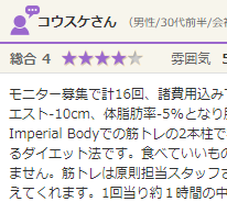 モニター募集で計16回、諸費用込みで税込12万円でプログラムに参加し、ダイエットを行いました。結果は約3ヶ月間で体重-8.5kg、ウエスト-10cm、体脂肪率-5%となり肥満体型か...